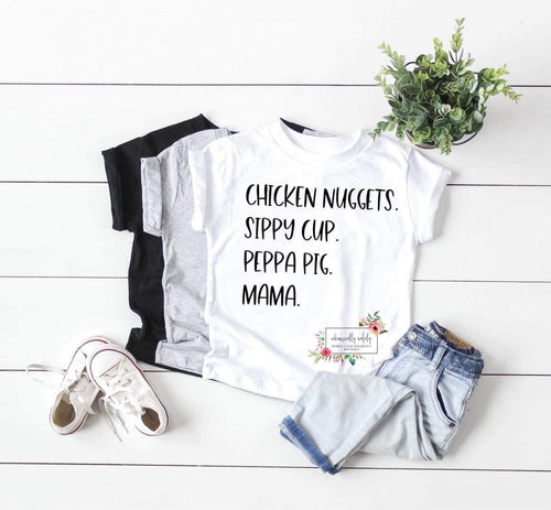Chicken nuggets.Sippy cup.Peppa pig.Mama
